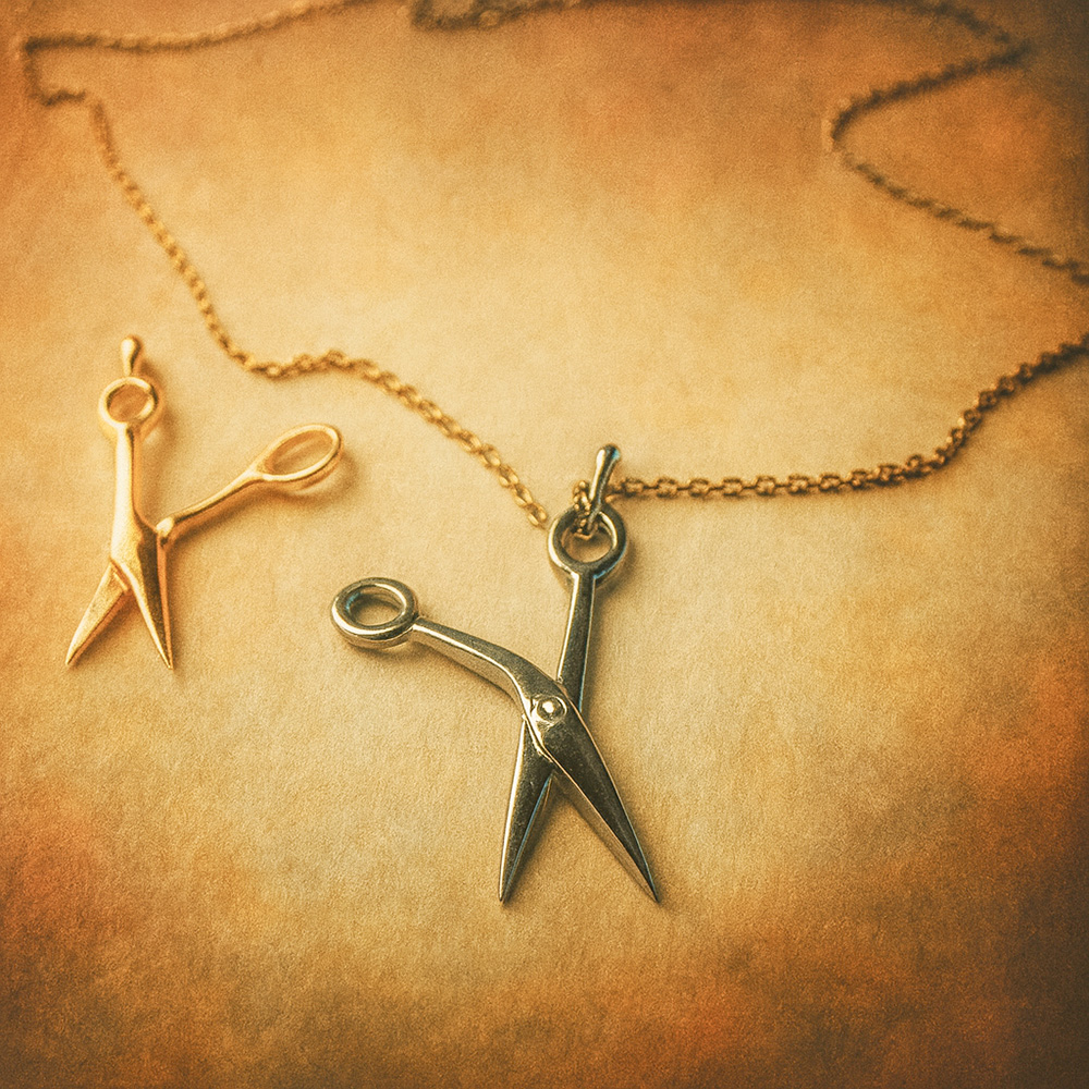 These handcrafted scissor pendants—one in 14ct yellow gold and the other in sterling silver—were custom designed and made to order for a hairstylist. Each piece captures the elegant lines of professional shears, shaped with smooth contours and polished finishes. Meaningful, symbolic, and individually crafted, they embody both artistry and personal identity in a refined, wearable form.