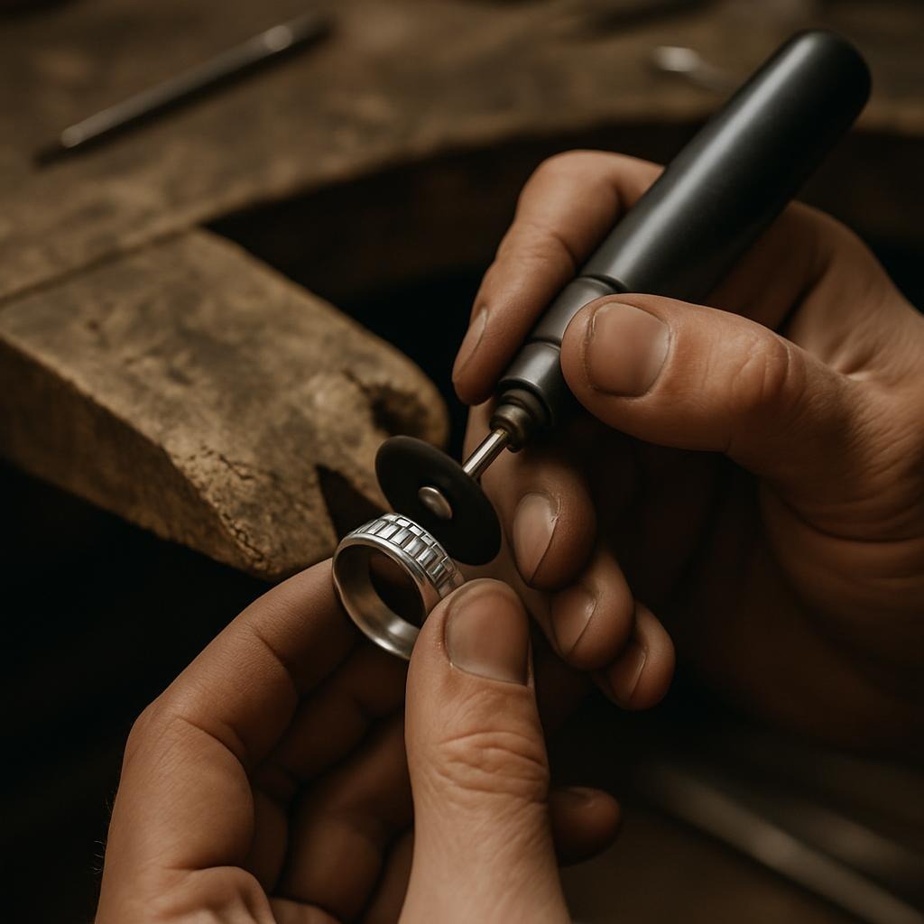 Finally, each piece is polished by hand, bringing out the full brilliance of the gold while highlighting subtle curves and intricate details. Every surface is refined to perfection, ensuring comfort as well as visual impact. The result is a ring that feels alive in the hand, a balance of elegance and artistry, where each touch carries the care and devotion of its maker.