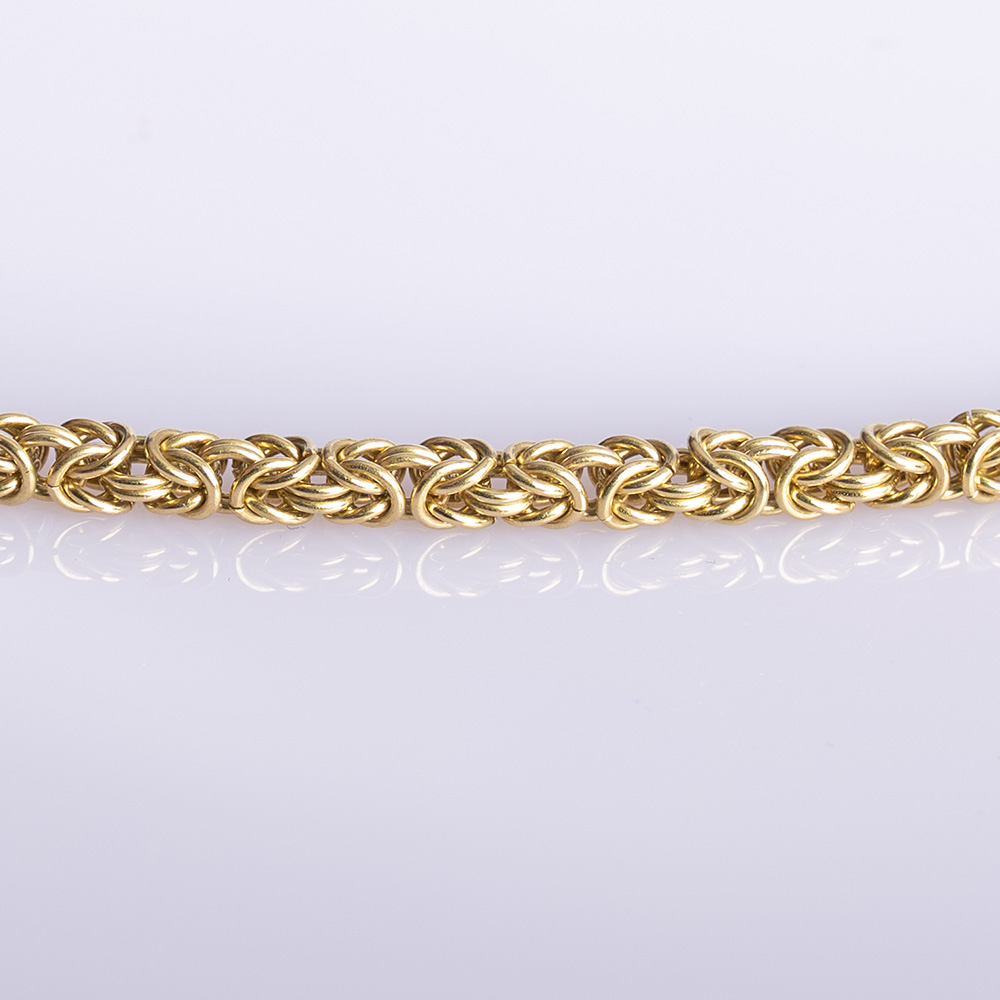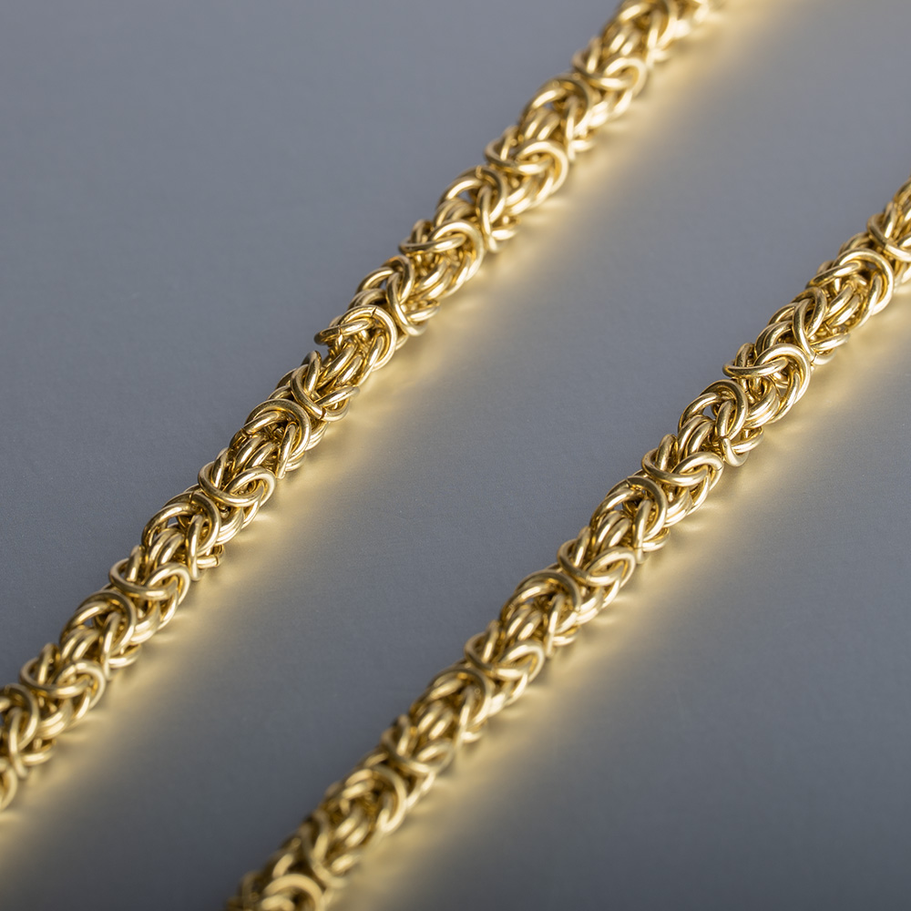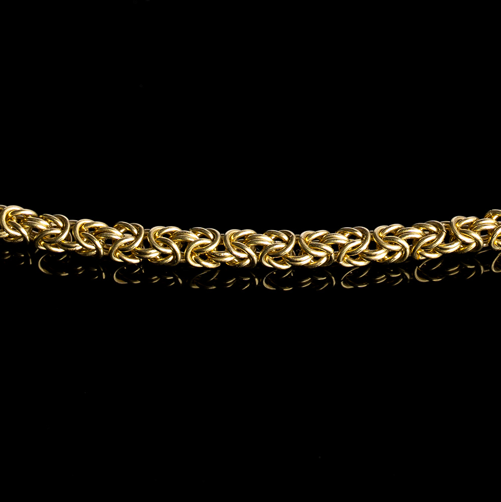 Inspired by the ornate artistry of the Byzantine era, each interlocking segment forms a richly textured, mesmerising weave that showcases both architectural beauty and artisanal precision. Handmade in Britain, the chain consists of hundreds of individually shaped and assembled links, each crafted to move fluidly while maintaining its impressive weight and presence.
