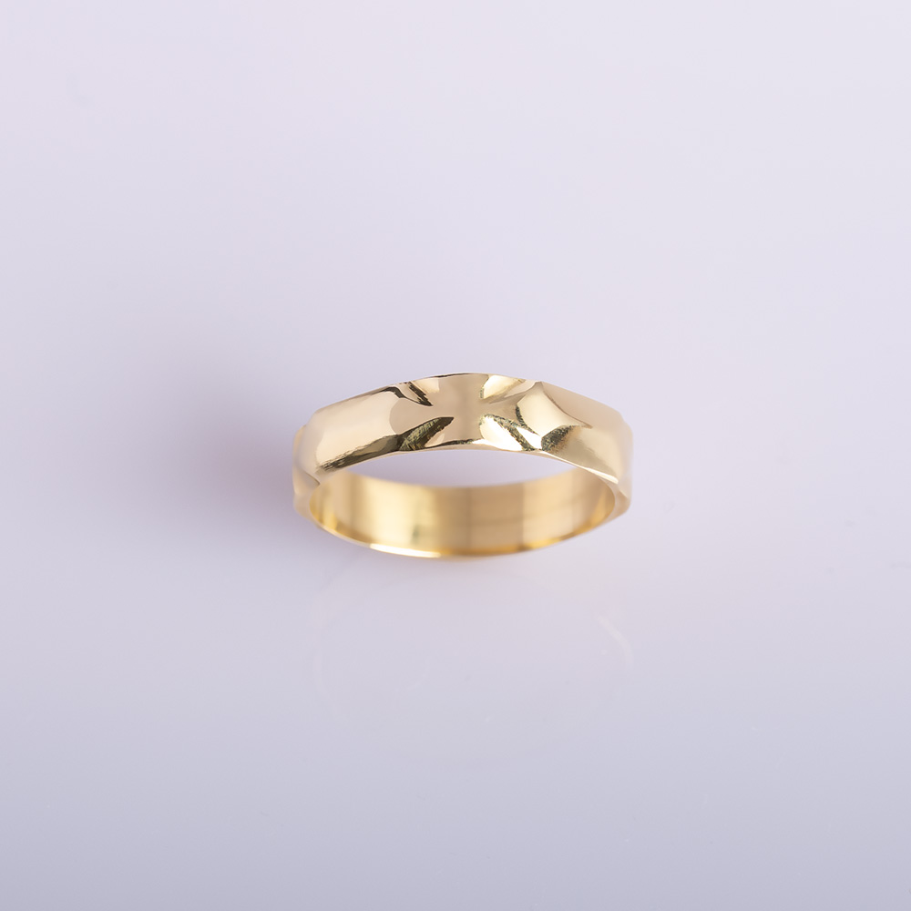 A handcrafted British-made gold wedding band featuring cross motifs and angled polished facets that form a central guiding line. Symbolic, architectural, and refined.